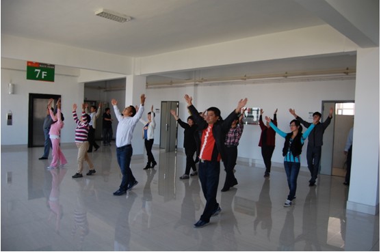 每天上午9:40在主楼7楼都会准时响起第八套广播体操的优美旋律,大家纷纷走出办公室,来到7楼大厅,找到各自的位置,站好队伍,随着 “一二三四……”的节奏,认真地做起广播体操,一招一式,有板有眼。